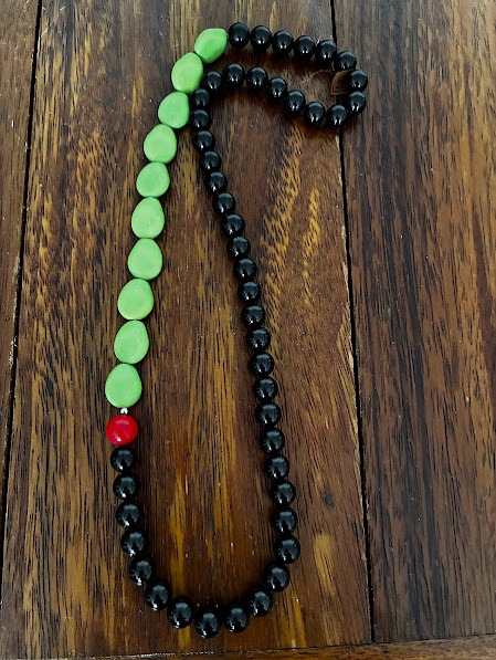 Colar com contraste entre tons escuros e verdes vibrantes, cheio de presença.